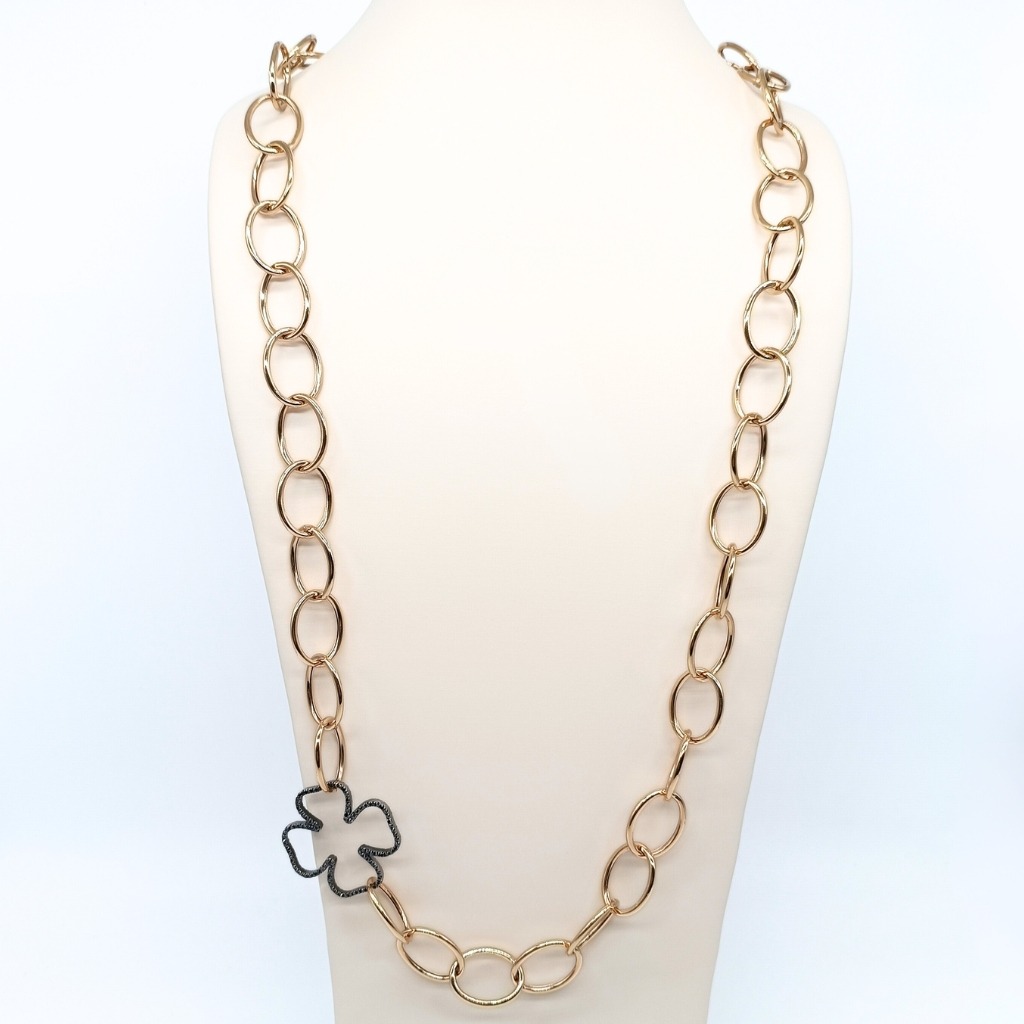 COLLAR DE ANILLAS EN ORO ROSA 18K Y TRÉBOL GRANDE CON DIAMANTES NEGROS EN ORO BLANCO RODIADO