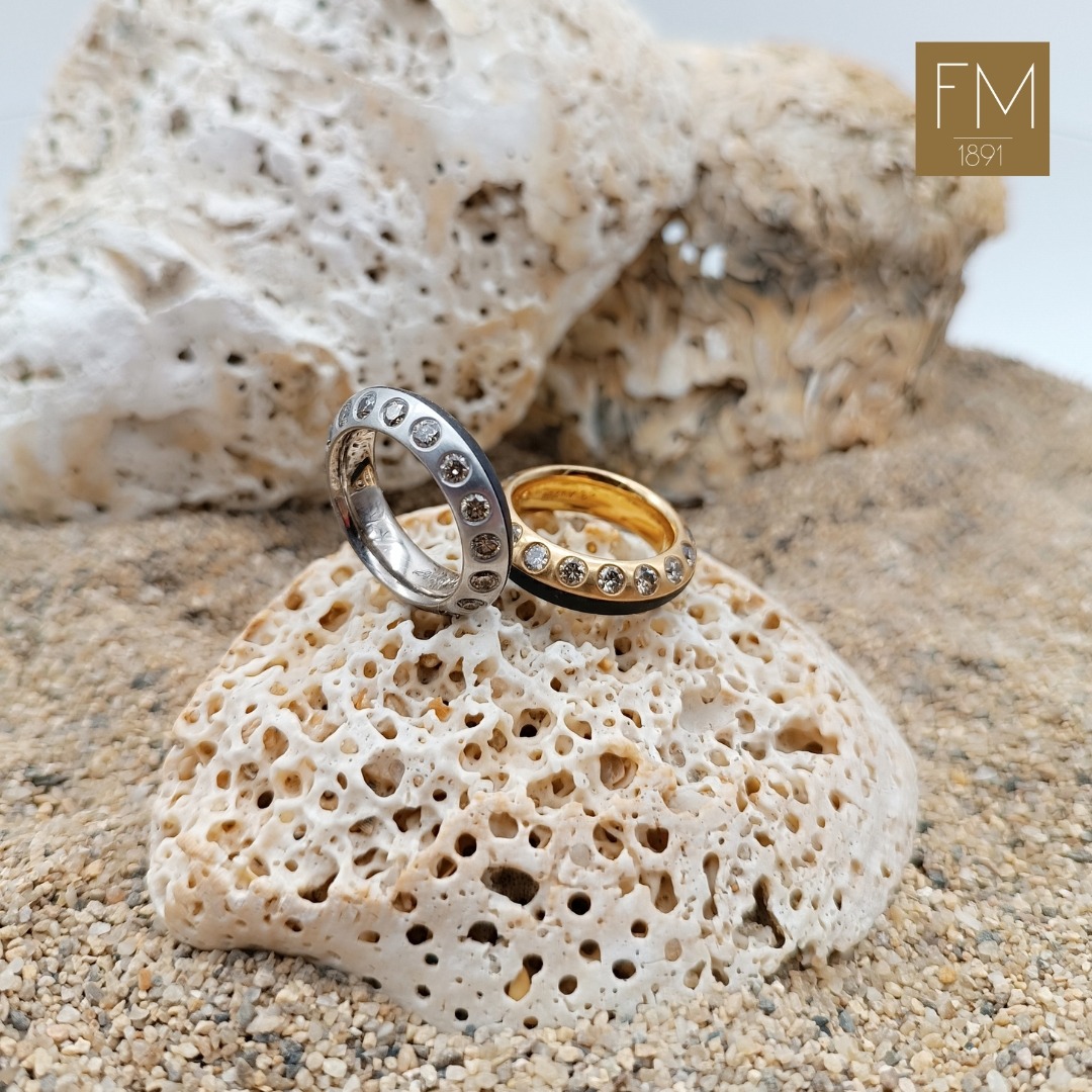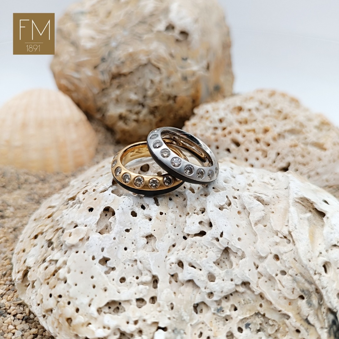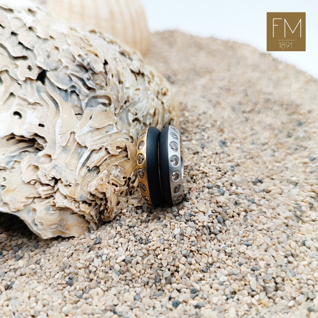 SORTIJA – ANILLO DE HIERRO NEGRO, ORO ROSA  Y DIECISIETE DIAMANTES TALLA BRILLANTE COLOR MADEIRA.